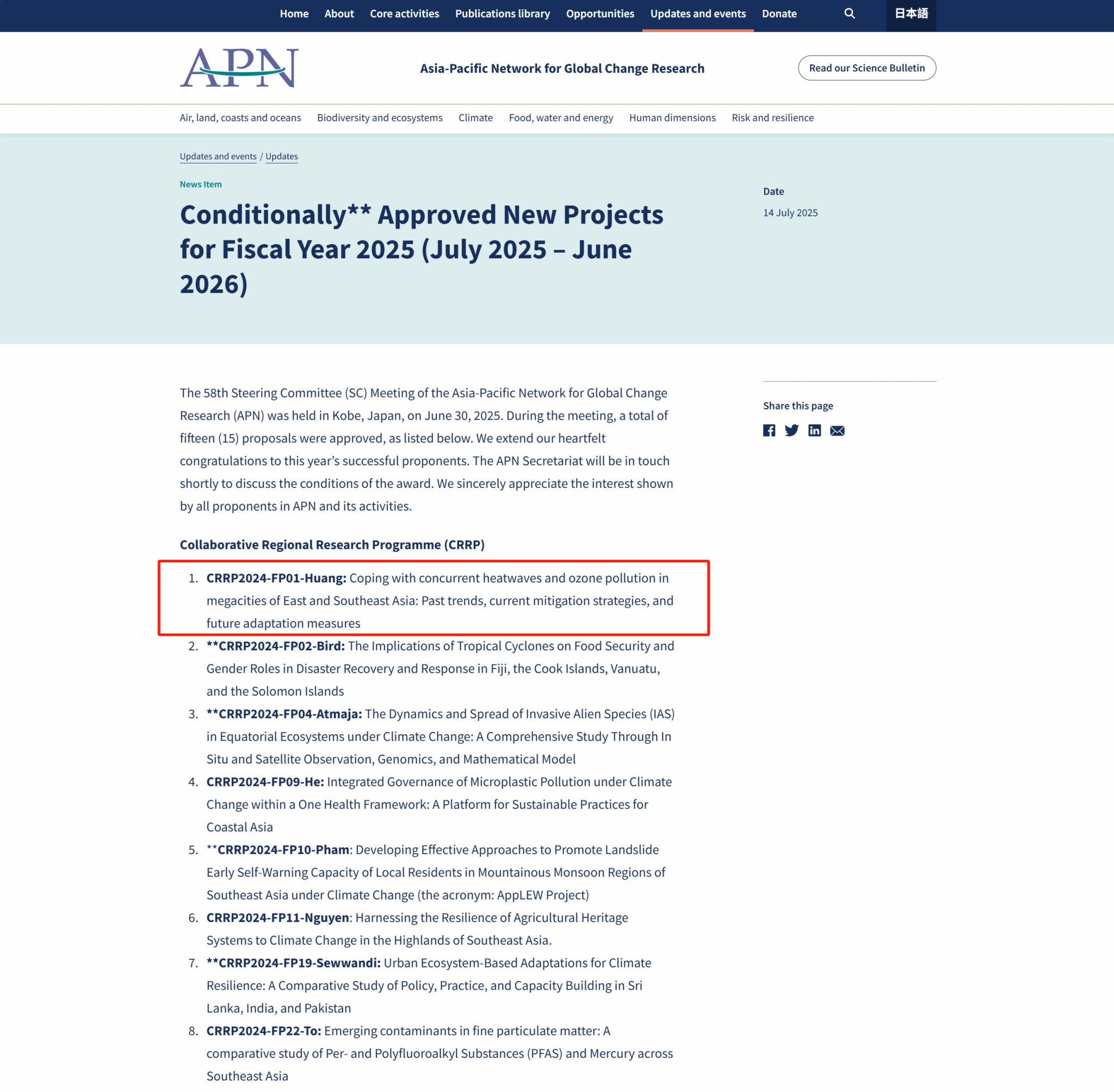 近日,由我们大气污染控制团队黄凌副研究员牵头,联合上海市疾控中心、马来西亚国立大学、马来西亚诺丁汉大学、泰国国王科技大学、韩国高丽大学、日本九州大学及美国Ramboll的学者,在前期合作基础上提出的“应对东亚与东南亚超大城市热浪与臭氧污染:历史趋势、缓解策略与未来适应措施”项目正式获得亚太全球变化研究网络(Asian Pacific Network for Global Change Research,简称APN)2025年协作区域研究计划(Collaborative Regional Research Programme, CRRP)资助。